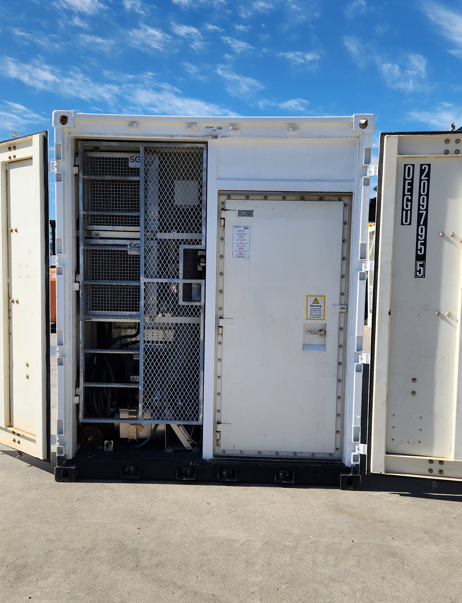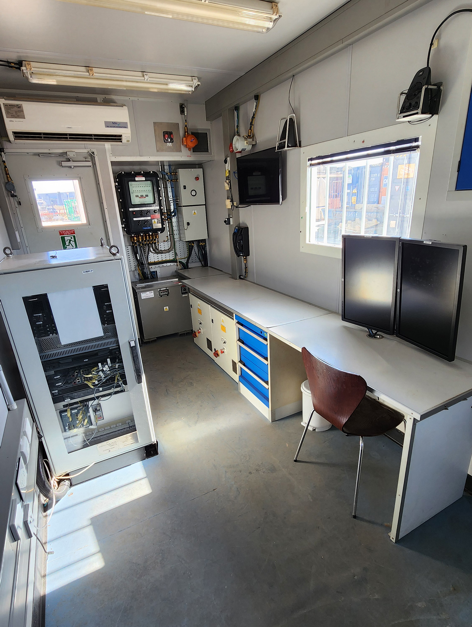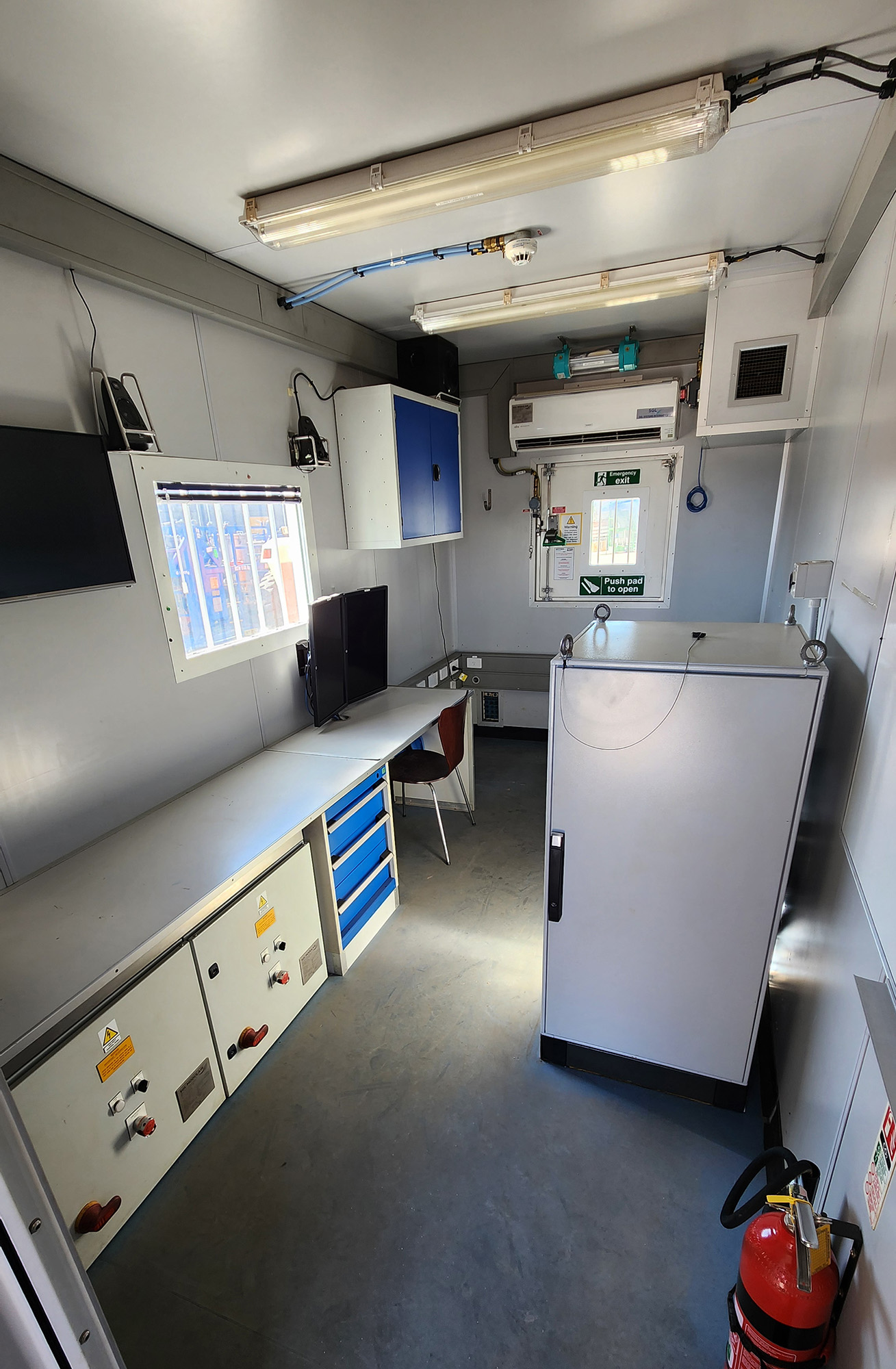 Power supply to the cabin is 380–690 V, 3ph, 50/60 Hz, connected directly to an external stainless-steel Ex junction box. The cabin is pressurised using clean air from a non-hazardous area, with the pressurisation fan maintaining an internal overpressure of approximately 100 Pa. The interior is fitted with workbenches, integrated cupboards and whiteboard.