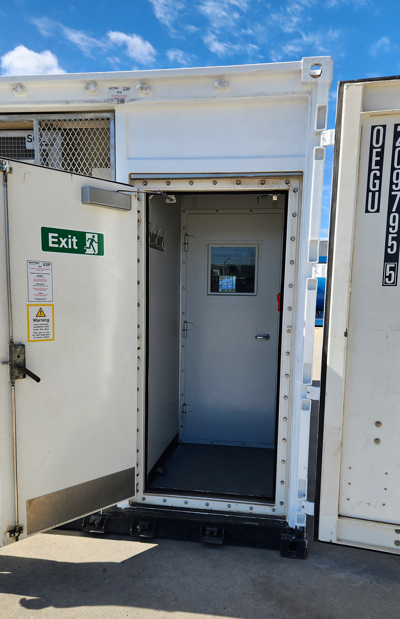 The cabin is designed, built and tested in accordance with DNV 2.7-1, and is both CSC plated and CE marked. It is equipped with a 1-off personnel door, a 1-off A60 escape hatch and a 1-off A60 window. The cabin floor is A60 fire-rated by means of a certified deck and screen.
