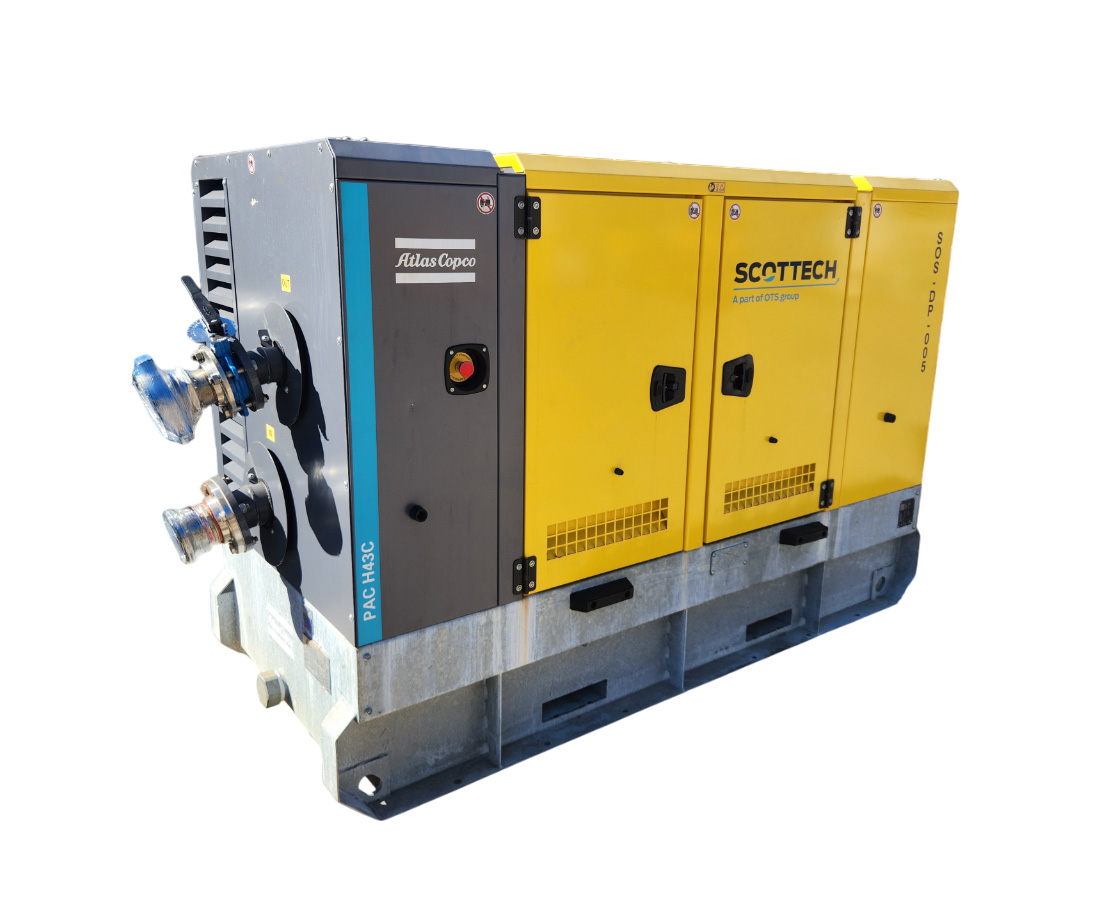 Part of Atlas Copco’s Head series, this pump system consists of a centrifugal pump and a separator, which enables air to be separated from the liquid and be sucked by a vacuum pump – making automatic priming possible. Even with suction heights of several meters the machine rapidly evacuates the air from the suction pipe and starts to pump. Additionally, thanks to the semi-open impeller, the PAC H range is also suitable for pumping liquids with solids in suspension.