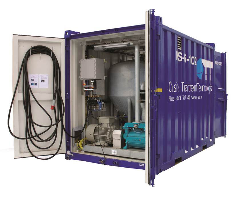 The system is Ex zone certified including ATEX and designed for multi-power operation, 400-690vac / 50-60Hz. The equipment consisting of a liquid ring pump mounted at a solid foundation with connection, motor and process tank. Hose pump for emptying of tank, internal piping and connection station, built in a container to DNV 2.7.1. with its own certified lifting equipment.